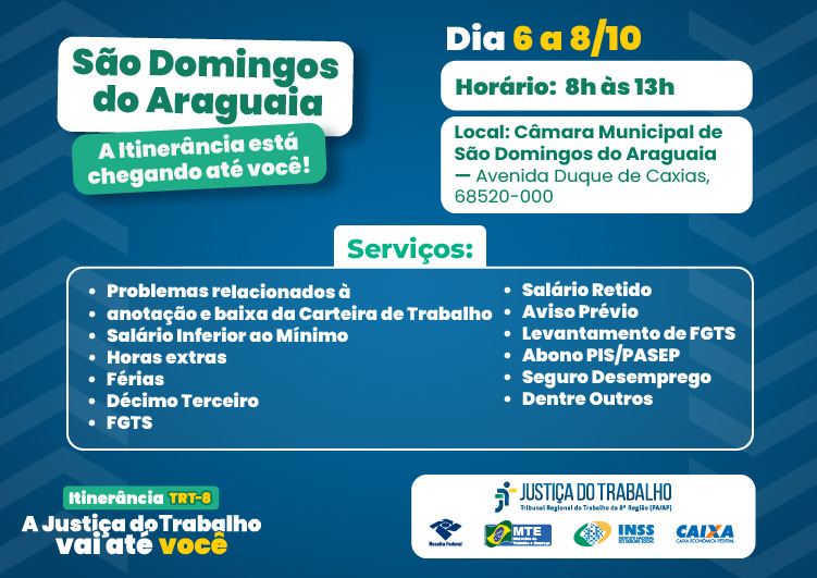 O Tribunal Regional da 8ª Região (PA/AP), buscando dar continuidade no programa “Justiça Itinerante”, levará diversos atendimentos até a população de São Domingos do Araguaia, a partir desta segunda-feira, dia 06, e segue com atendimentos até quarta-feira, 08 de outubro de 2025. Os atendimentos serão realizados na Câmara Municipal da cidade, localizada na rua Acrísio Santos, das 08h às 13h.