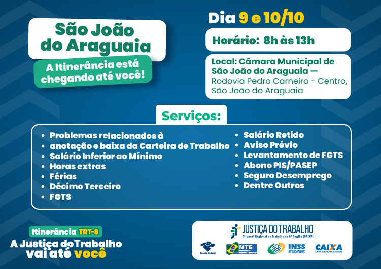 Nos dias 9 e 10 de outubro de 2025, das 8h às 13h, o Tribunal Regional do Trabalho da 8ª Região (PA/AP) realizará atendimentos gratuitos à população de São João do Araguaia por meio do programa Justiça Itinerante. A ação acontecerá na Câmara Municipal, localizada na rodovia Pedro Carneiro, no centro da cidade.